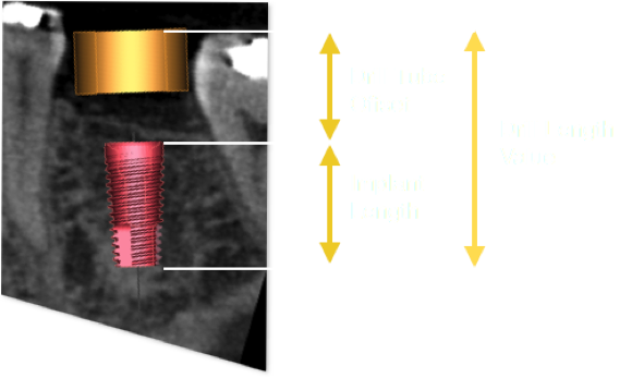 Drill Length Value is the sum of the implant length and the drill tube offset. This offset value is normally measured from the interface of the implant to the top surface of the drill tube. When using drill spoons the drill length value is increased by the thickness of the drill spoon used.